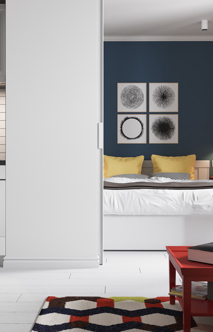 用红色外罩将油烟机包裹,并在背景墙上装饰一幅油画。既与烹饪区的白色橱柜形成反差,又与储存区的红色橱柜相呼应,跳跃的色彩与油画使单调的灶台活泼可爱。